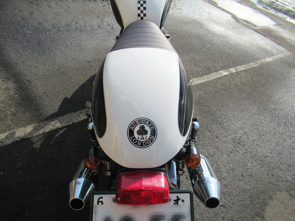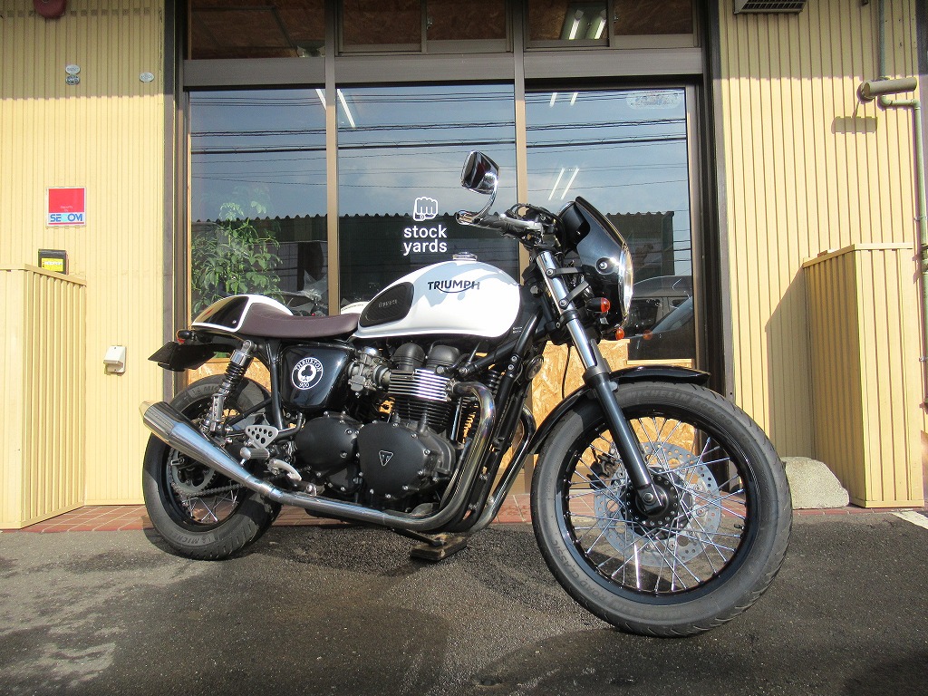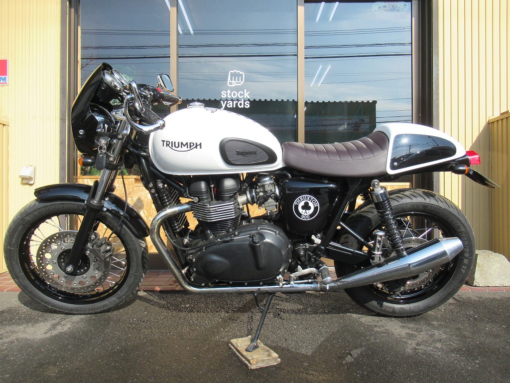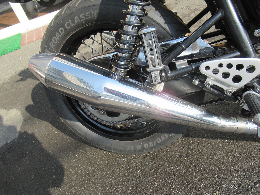 865ccの空冷2気筒エンジンは、トライアンフの2気筒で最大出力68馬力。専用に設計されたスタイリッシュなバーエンドミラー、メガフォンスタイルのサイレンサーを採用。